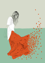 Illustration of a woman in a red skirt that turns into leaves with wind. A poster that values the female figure and freedom. Don't be afraid of the bright colors! Adding colorful frames will make all the difference when decorating your home.