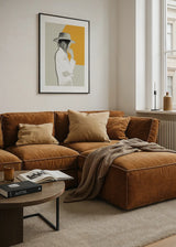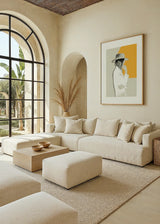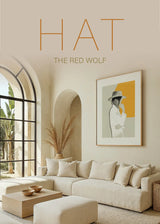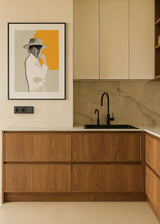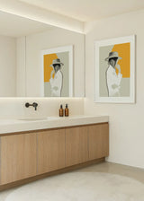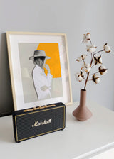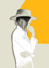 Illustration of a woman in profile with hat, white shirt and closed eyes. A frame with a contemporary and timeless look. The yellow color of the background conveys a positive energy and fits in environments of modern decoration.