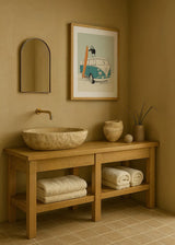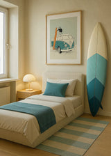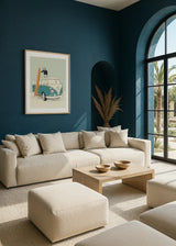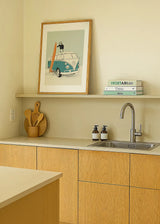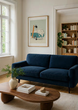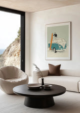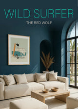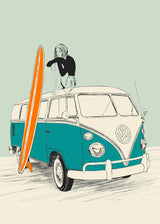 Illustration of a female surfer sitting on a Volkswagen Kombi with her orange Longboard surfboard. A poster that reminds us of summer days near the sea and trips close to nature. With this painting your home will have a more friendly and relaxed atmosphere.